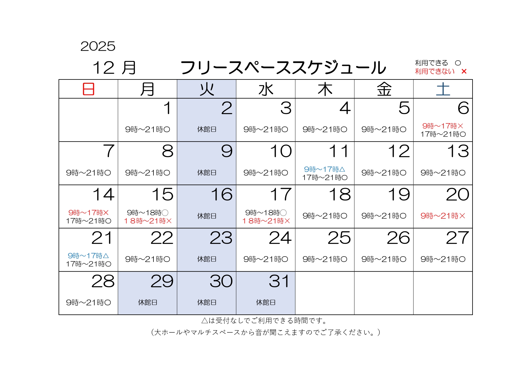 ※赤字の日時はイベント等開催のため利用ができません。 急な日程変更の場合は当館SNS(X、インスタグラム)でお知らせいたします。