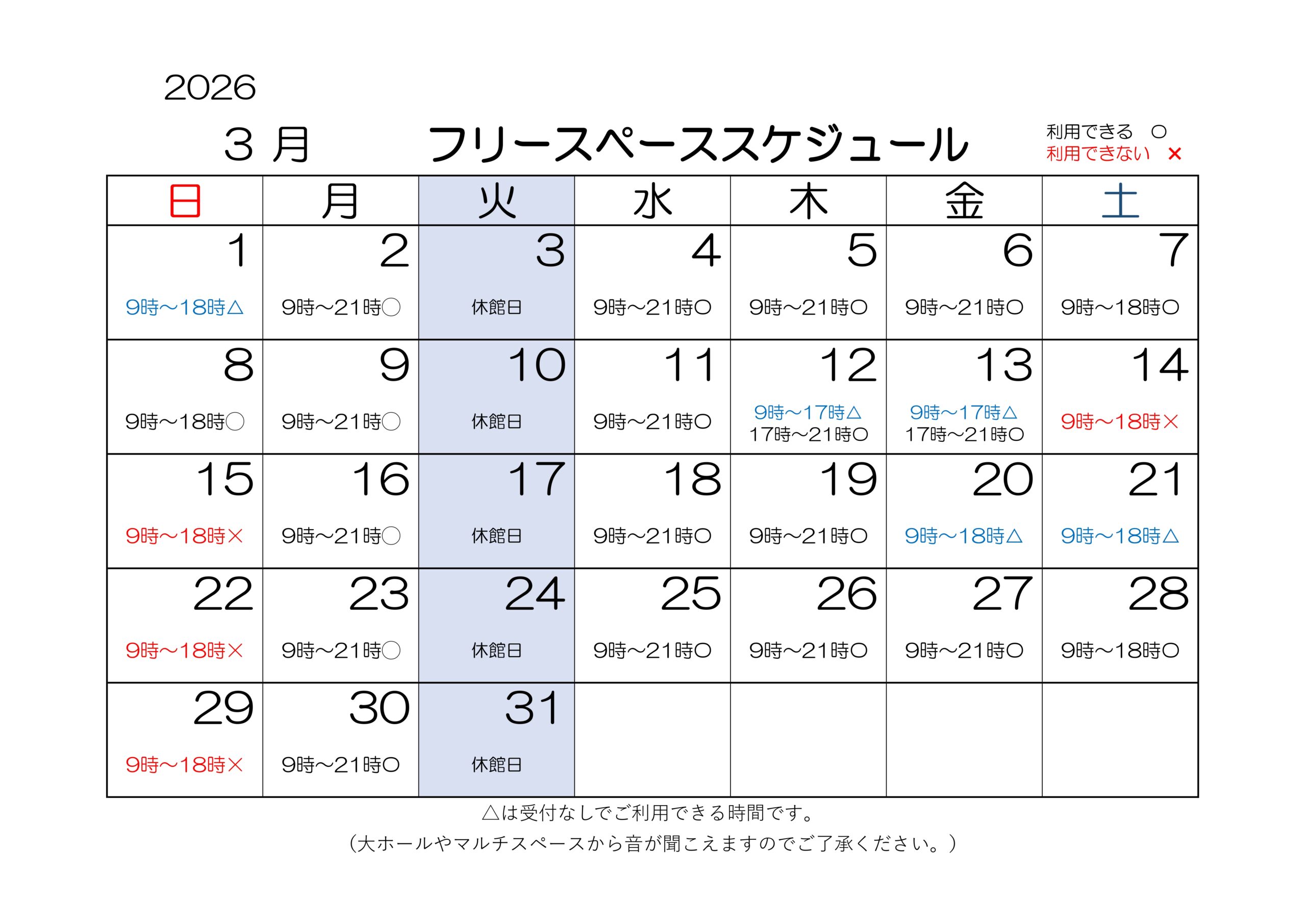 3月のフリースペースの予定